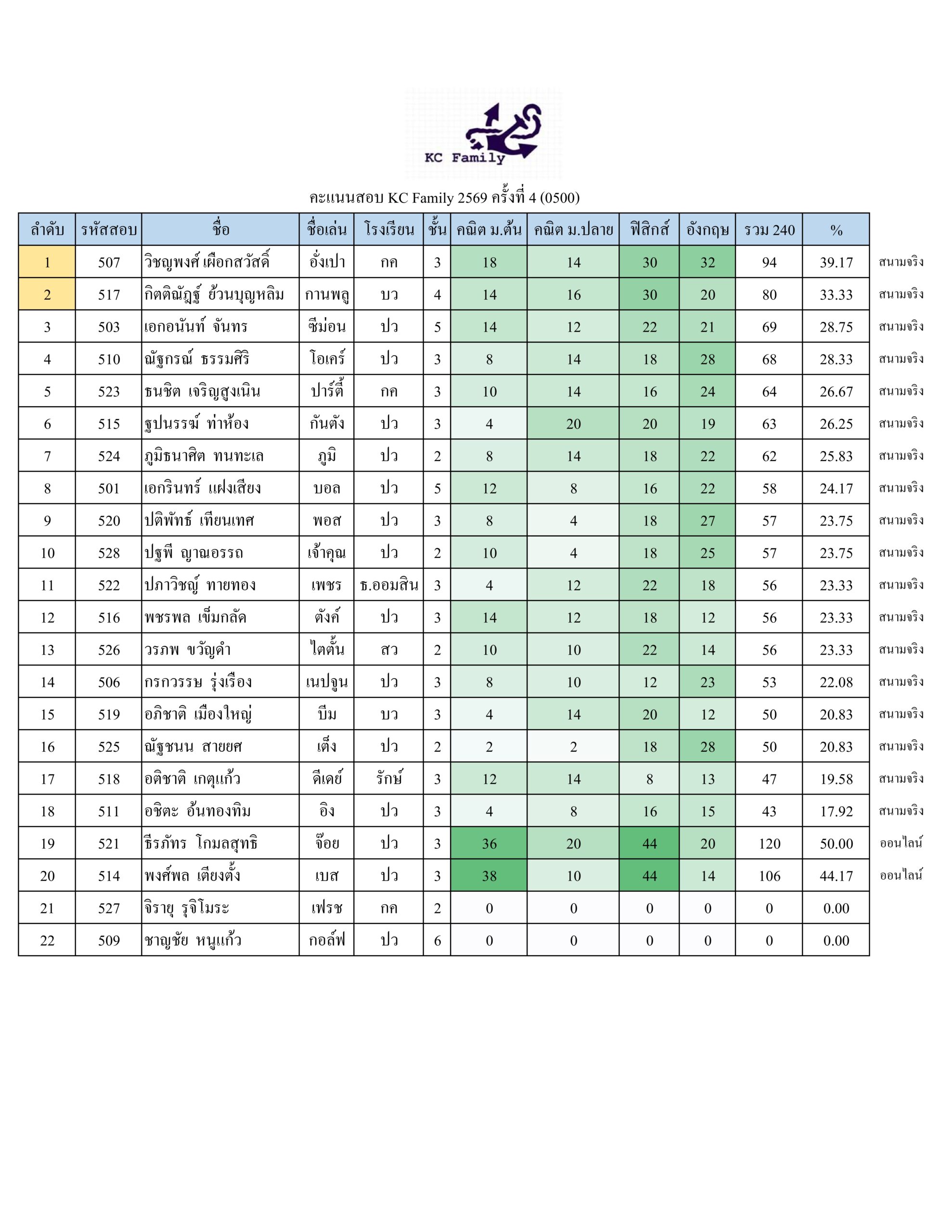 ประกาศผลสอบ KC Family 2569 ครั้งที่ 4 ประกาศผลสอบ KC Family 2569 ครั้งที่ 4 (0500) ผู้เข้าชม : 1...