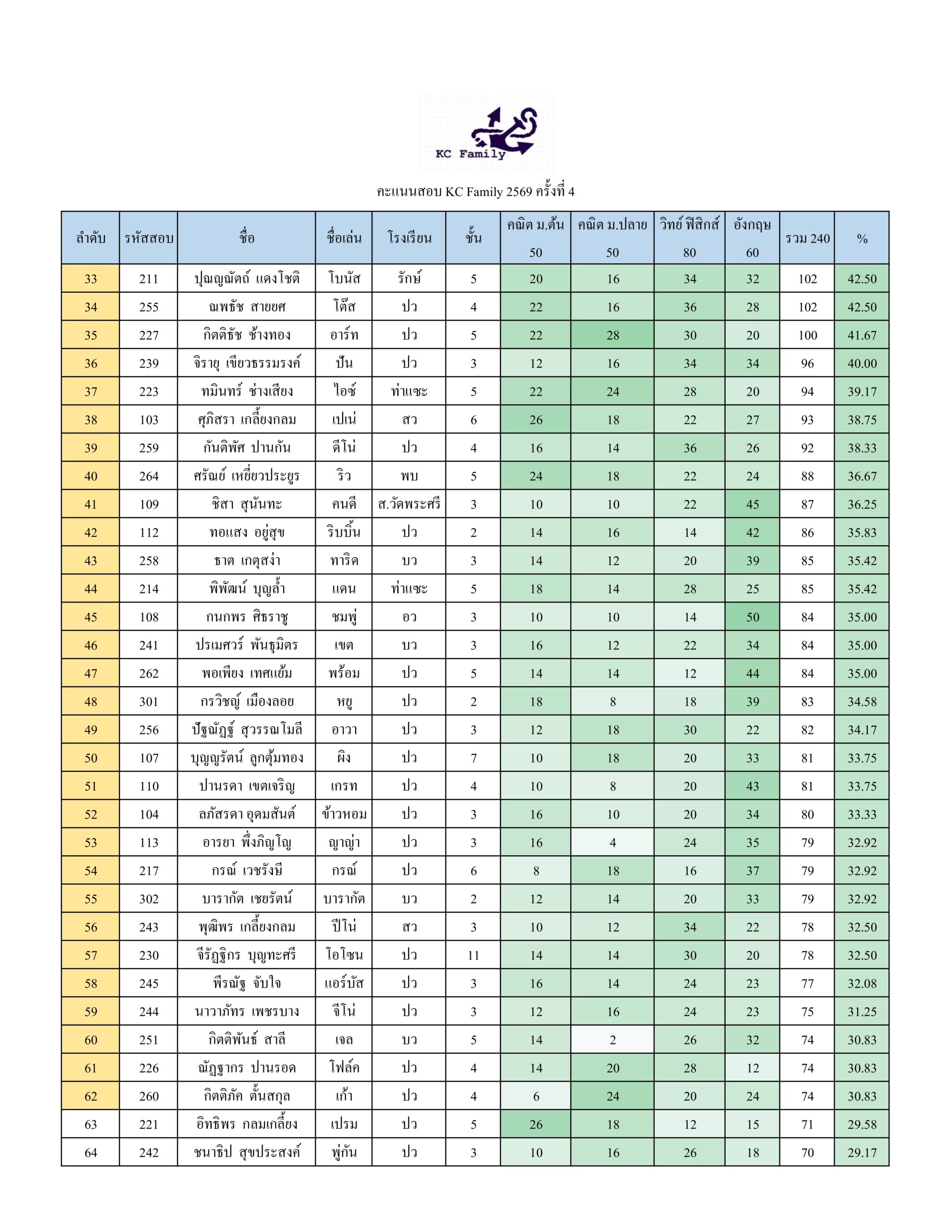 ประกาศผลสอบ KC Family 2568 ครั้งที่ 5 วันที่ 21 ธ.ค.67 (คะแนนรอบสุดท้าย วิชาการ + พละ) ประกาศผลสอบ KC Family 2568 ครั้งที่ 5 วันที่...